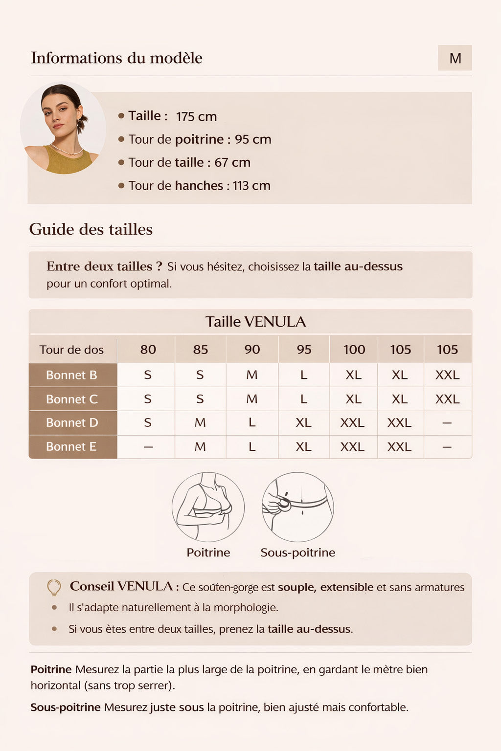 Prenez vos mensurations (tour de poitrine, taille et hanches) pour choisir la taille la plus adaptée.
